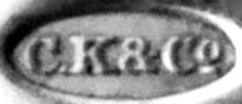 ![]() | C K & Co | 1912 | Imported watch case | Mark not found in CulmeCulme, John - Directory of Gold and Silversmiths, Jewellers and Allied Traders 1838-1914, Antique Collectors' Club, 1987. It may be an unregistered mark (possibly of Camerer, Kuss & Co) as it was seen on a Waltham watch case with their "AB" sponsor's mark |