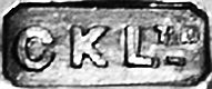![]() | Charles Kay (probably) | 1826 (registered Mar 1822) | Box | Kay's mark as illustrated by GrimwadeGrimwade, Arthur - London Goldsmiths, 1697-1837: Their Marks and Lives, Faber & Faber, 1990 does not have a pellet between the letters. A similar mark (also without pellets but with more rounded ends) registered Oct 1828 by Charles Kelk |